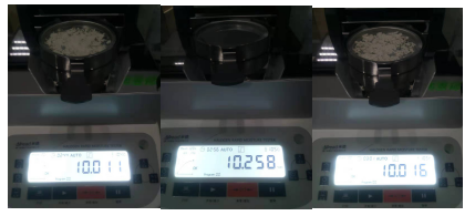 3.用實(shí)驗(yàn)勺取6.643克重的氟化鈣礦粉(A3樣品)均勻鋪在樣品盤(pán)上,設(shè)置好合適的溫度后蓋下上蓋,按下“START”鍵開(kāi)始測(cè)試;蜂鳴兩聲后,儀器自動(dòng)停機(jī),測(cè)試結(jié)束,可在液晶顯示屏查看測(cè)試后氟化鈣礦粉的水含量為10.011%;