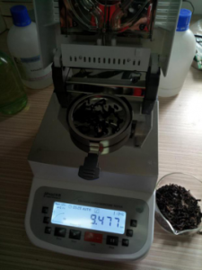 - 測試茶葉片:為了使測試過程中茶葉水分儀將茶葉烘干烘透,我們將茶葉攤成分散狀,以便溫度能滲透進去。取2克茶葉片絲置于不銹鋼托盤中,用鑷子將茶葉片絲平鋪均勻,為避免茶葉烘烤后變焦,我們將溫度設置在135℃,按“START”鍵開始測試,5分28秒后檢測結束,檢測數(shù)據(jù)顯示9.477%;